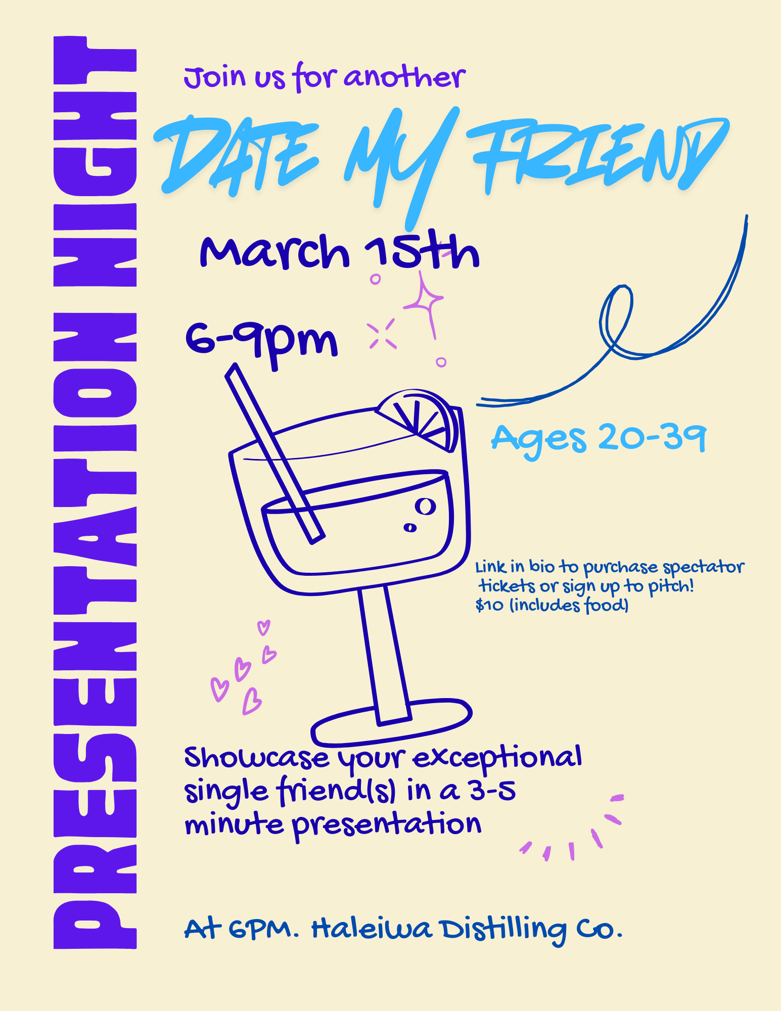 This Presentation Night is Sunday March 15th from 6-9pm and for ages 20-39. There will be 10 presentation spots available on a first sign up basis.